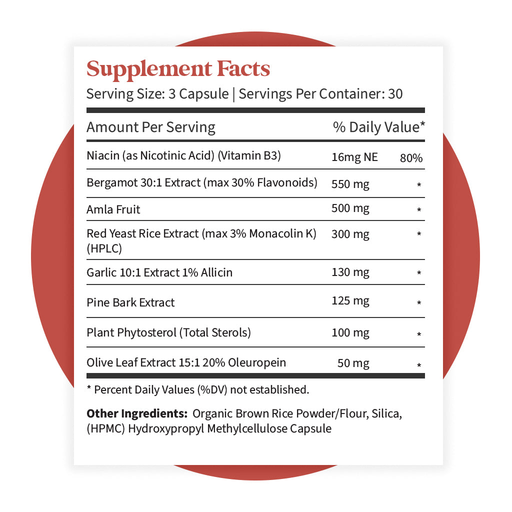 Niacin (as Nicotinic Acid) (Vitamin B3), Bergamot Extract, Amla Fruit, Red Yeast Rice Extract, Garlic Extract, Pine Bark Extract, Plant Phytosterol, and Olive Leaf Extract.